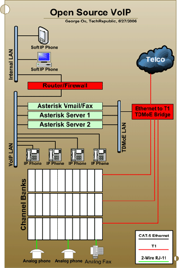 TDMoE(基于以太網(wǎng)的時分復(fù)用)LAN段負責PBX-語音郵箱和PBX-信道處理單元的通信。在過去,這些設(shè)備間的TDM通信使用昂貴的T1卡,但是通過將TDM通信搬到廉價的以太網(wǎng)上,這一點已經(jīng)得到極大的改善。