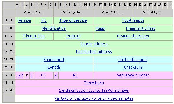 IPv4的報(bào)頭長20個(gè)字節(jié)(8bit),UDP報(bào)頭為8字節(jié),RTP報(bào)頭為12字節(jié)。圖2所示為語音信號的封裝格式。