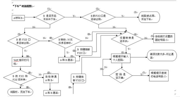 - 若A是為了下車,則B端接聽方按鍵“*#*”切斷FXS通路,然后進入⑷--⑻。
