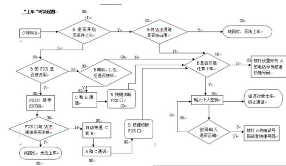 - 若C是為了上車,則B端接聽方按鍵“*#*”切斷FXS通路,進入⑷--⑻