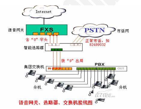 使用網(wǎng)關(guān)電話打國內(nèi)/國際其他普通公話或手機(jī),稱為“點(diǎn)對面模式”。在使用智能路由選線器以后,打出電話時(shí)自動(dòng)根據(jù)首位字頭,例如“0”,判斷選擇市話或者VOIP專線通話,--字頭有“0”,時(shí)自動(dòng)走VOIP網(wǎng)絡(luò)線路,字頭沒有“0”時(shí),選擇走通常的市話線路,完全不改變我們過去使用電話的習(xí)慣!