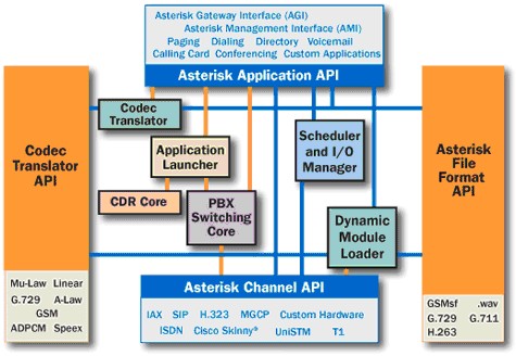 Asterisk具有傳統(tǒng)PBX無(wú)法比擬的優(yōu)點(diǎn),那就是其靈活性,可擴(kuò)展能力;Asterisk的擴(kuò)展能力是通過(guò)開(kāi)放相應(yīng)的架構(gòu)和接口來(lái)實(shí)現(xiàn)的。這就意味著Asterisk是一個(gè)組件而不是一個(gè)成型的產(chǎn)品,Asterisk的核心提供了一個(gè)基本的可運(yùn)行環(huán)境,而外圍相應(yīng)的能力則可以通過(guò)加載和配置相關(guān)的插件和模塊來(lái)實(shí)現(xiàn)。