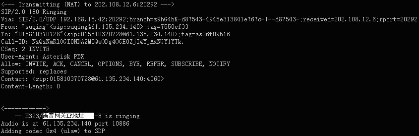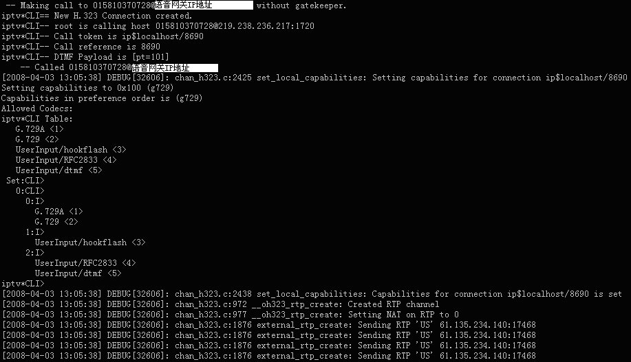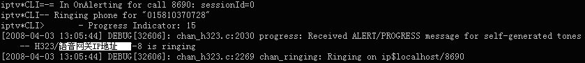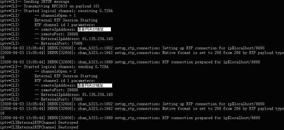 表示軟交換Asterisk與華為8010語音網(wǎng)關(guān)的H323連接已經(jīng)成功建立