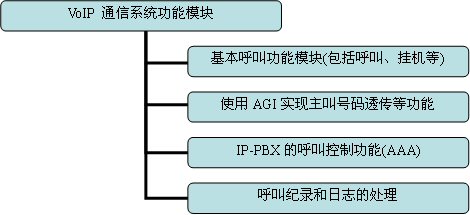 如果是基于純軟件的實(shí)現(xiàn)方案,Asterisk是構(gòu)建VoIP項(xiàng)目的核心,系統(tǒng)中所有與用戶呼叫有關(guān)的功能和管理都通過它來實(shí)現(xiàn),包括VoIP各種協(xié)議的互通和配置,以及各種呼叫設(shè)備的配置文件。本文檔所討論的VoIP通信系統(tǒng)基本功能如圖3-2所示,一般的Asterisk的任務(wù)包括了兩方面,一是與呼叫有關(guān)的,包括基本呼叫處理、主叫號碼透傳、呼叫紀(jì)錄和日志生成等,二是與呼叫控制有關(guān),即終端用戶的認(rèn)證計(jì)費(fèi)功能。