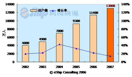 從圖中可以看出,國內即時通訊用戶數(shù)保持了較快的發(fā)展速度,從2002-2006年年均增長率為26.6%,到2007年國內即時通訊用戶數(shù)將達到1.3億。