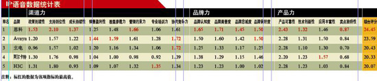 從綜合評(píng)分情況來(lái)看,思科、Avaya以明顯的優(yōu)勢(shì)位列IP語(yǔ)音產(chǎn)品的第一集團(tuán),他們的優(yōu)勢(shì)非常明顯,幾乎在所有指標(biāo)上都位居前列,而包括北電、阿爾卡特朗訊和H3C在內(nèi)的品牌位列第二集團(tuán)。