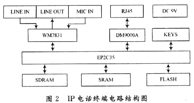 根據(jù)1P電話終端的硬件需求,為該終端配置了音頻接入口、音頻編解碼芯片WM8731;網(wǎng)絡(luò)接口芯片DM9000A;存儲器IC42S16400;主控制器EP2C35;直流電源9