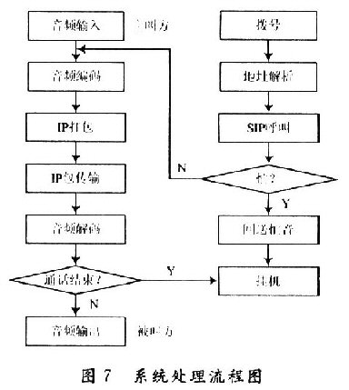 當撥號確認后,主控制器對編解碼器發(fā)送控制指令,開始語音A/D轉(zhuǎn)換,并進行編碼,送到片外存儲器內(nèi)進行緩存;Nios CPU對撥號信息的解析確定。目的地址,通過Avalon總線對以太網(wǎng)接口發(fā)送數(shù)據(jù)傳輸指令;將符合以太網(wǎng)標準的數(shù)據(jù)從片外存儲器內(nèi)讀出,送入Internet中,返回確認信息。系統(tǒng)處理流程圖如圖7所示。