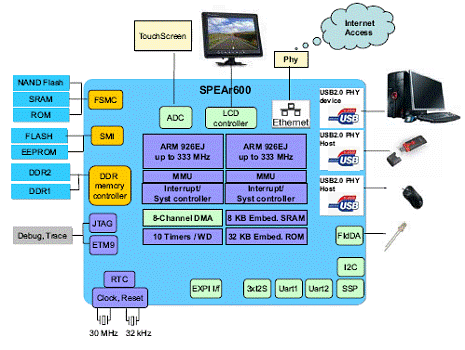 SPEAr600 是具有雙ARM926EJ-S核的嵌入式MPU, 性能高達733 DMIPS,支持靈活的存儲器,有功能強大的連接特性和可編程的LCD接口. ARM926EJ-S內(nèi)核的工作頻率高達333MHz,其中的MMU支持虛擬的存儲器管理,是系統(tǒng)能和Linux操作系統(tǒng)兼容.主要用在需要大量計算的應用中如企業(yè)VoIP設(shè)備,可編邏輯控制器(PLC),醫(yī)療實驗室/診斷設(shè)備,無線接入設(shè)備,家用電器等.本文介紹SPEAr600主要特性,方框圖, 典型系統(tǒng)架構(gòu)圖以及EVALSPEAR600評估板主要特性,電路圖和材料清單(BOM).