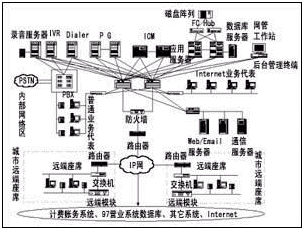 該方案采用Cisco的ICM中間件軟件作為系統(tǒng)的CTI服務(wù)器軟件平臺(tái),并采用相關(guān)廠商的IVR和Dialer產(chǎn)品作為IVR服務(wù)器和外撥服務(wù)器軟件。地市客服中心采用了交換機(jī)的遠(yuǎn)端模塊設(shè)置遠(yuǎn)端座席。Cisco的ICM中間件不但具有大話務(wù)量處理的高性能,而且支持多點(diǎn)呼叫中心的設(shè)置和基于純IP技術(shù)的呼叫中心的擴(kuò)充,從而保證了系統(tǒng)的可擴(kuò)展性。系統(tǒng)結(jié)構(gòu)如圖1所示。