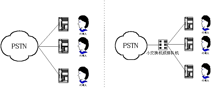 呼叫中心,早期是指一個(gè)由兩人或更多人組成的、在一個(gè)特定地方用專用設(shè)備處理電話業(yè)務(wù)的小組。這些人就是通常所說的呼叫中心代理(人)。一個(gè)呼叫中心可以只提供信息接收服務(wù),或者只提供信息發(fā)送服務(wù),或者是一個(gè)混合式呼叫中心,其呼叫中心代理會(huì)負(fù)責(zé)所有這兩項(xiàng)工作。從物理設(shè)備構(gòu)成來看,第一代呼叫中心可用下圖(1)、(2)表示。