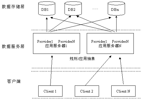 在大規(guī)模系統(tǒng)中,為保證數(shù)據(jù)庫訪問的效率和安全性,數(shù)據(jù)訪問方式一般采用由Client、中間層應(yīng)用服務(wù)器(或叫規(guī)則服務(wù)器)和Server組成的三層Client/Server結(jié)構(gòu)。將數(shù)據(jù)庫應(yīng)用劃分為邏輯上的三個(gè)層次,客戶程序只關(guān)心數(shù)據(jù)的顯示與用戶界面;應(yīng)用服務(wù)器處理客戶數(shù)據(jù)查詢與更新請求,可在應(yīng)用服務(wù)器上定義數(shù)據(jù)操作規(guī)則以保證數(shù)據(jù)操作的合法性、安全性與有效性。在三層結(jié)構(gòu)下,方便了軟件的修改和模塊的疊加,客戶端通過應(yīng)用服務(wù)器訪問數(shù)據(jù)庫服務(wù)器,客戶端并不直接與數(shù)據(jù)庫服務(wù)器建立連接,從而減輕了數(shù)據(jù)庫服務(wù)器的壓力,提高整個(gè)應(yīng)用系統(tǒng)的運(yùn)行效率。