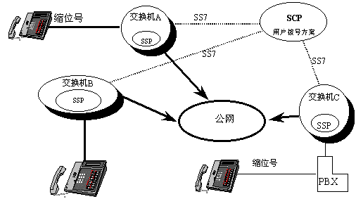 縮位撥號是指用一短的撥號(如三位)代替一長的撥號(如八位)的撥號方案。如下圖所示的智能網(wǎng)中,交換機(jī)A、B、C所有用戶的撥號方案數(shù)據(jù)都由SCP管理,當(dāng)交換機(jī)收到用戶的縮位撥號后,通過SS7鏈路訪問SCP數(shù)據(jù)庫,返回對應(yīng)的電話號碼,然后交換機(jī)通過公網(wǎng)把呼叫接通到該電話號碼,就和用戶直接撥打該電話號碼一樣。