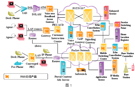 其具體技術(shù)內(nèi)容包括:語音IP (VoIP)、語音DSL (VoDSL)和語音無線本地環(huán)路(VoWLL);以及用于確保IP語音、視頻和數(shù)據(jù)通信性能的其他技術(shù)。圖1顯示了NMS公司的產(chǎn)品在整個(gè)通信應(yīng)用(包含PSTN網(wǎng)絡(luò)和IP分組網(wǎng)絡(luò))中的位置。