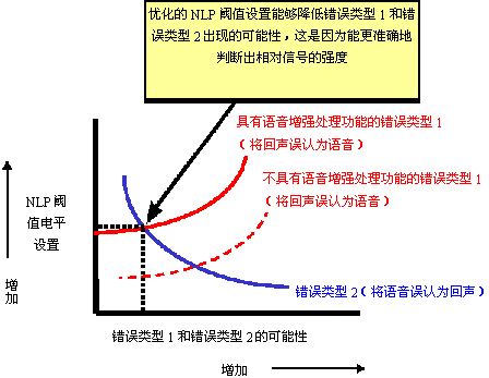 dB)能夠顯著降低將雙對話語音信號誤認(rèn)為聲學(xué)回聲信號的概率,從而防止了"錯誤類型2"?傊"錯誤類型1"(實線曲線,具有語音增強特性)和"錯誤類型2"曲線的交叉點上,通過與之對應(yīng)的NLP設(shè)置,可以獲得最佳的性能(請參見圖10)。