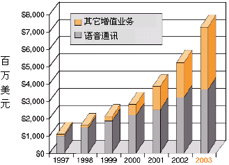 為了獲得競爭優(yōu)勢,業(yè)務(wù)提供商──傳統(tǒng)長途運營和本地交換運營商,因特網(wǎng)業(yè)務(wù)提供商(ISP),應(yīng)用業(yè)務(wù)提供商,以及無線運營商──都在想方設(shè)法發(fā)布基于IP的業(yè)務(wù),這些業(yè)務(wù)應(yīng)該:對用戶有較高的價值,能縮短面市所需時間,部署是低成本高效益的。向用戶提供高價值的增值業(yè)務(wù)能為業(yè)務(wù)提供商帶來重要的收入源泉,并使他們更有特色,增加市場分額,特別是如果這些業(yè)務(wù)以快速、易于支持的方式部署,以上這些優(yōu)勢就會更加突出。據(jù)估計,到2003年增值業(yè)務(wù)設(shè)備僅在美國就能達到73億美元的市場,正如圖1所示。