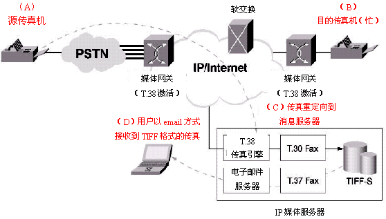 T.38規(guī)定了實時IP傳真的標準。因此,源于PSTN的一個傳真會話能夠以T.38的格式進入IP網(wǎng)絡(luò)。在IP媒體服務(wù)器中通過使用T.30,T.38和T.37,實時傳真會話可以把IP媒體服務(wù)器作為終端,并把實時傳真轉(zhuǎn)換成T.37兼容的傳真消息。然后,這個傳真消息會被用來產(chǎn)生一個就象一個電子郵件會話的T.37傳真。這使得IP媒體服務(wù)器可以提供"永不示忙"的IP傳真功能。這個功能也將為統(tǒng)一消息應(yīng)用提供基于IP的傳真郵箱能力。