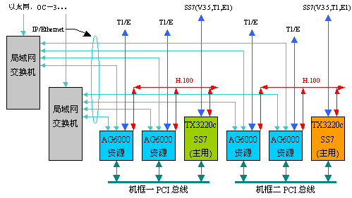 結(jié)構(gòu)圖中表示有兩臺(tái)機(jī)器,每臺(tái)機(jī)器都插有兩塊AG6000資源卡和一塊TX3220c卡。一臺(tái)機(jī)器是主用的,而另一臺(tái)是冗余備份的。AG6000完成媒體網(wǎng)關(guān)的功能,TX3220c完成信令網(wǎng)關(guān)的功能,媒體網(wǎng)關(guān)控制器是軟件實(shí)現(xiàn)的,沒(méi)有對(duì)應(yīng)的硬件。