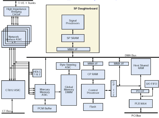 (T-1和E-1裝配有所不同) 兩塊子板上面各有一組DSP. 當開電時電話信令協議和語音處理功能被下載到板卡上. 在處理器上作為固件存在,