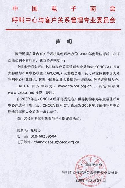 鄭重聲明: CNCCA授權CTI論壇為2009年度中國(亞太)最佳呼叫中心評選和年度大會的唯一承辦單位。