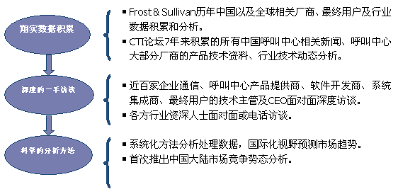Frost & Sullivan 和 CTI論壇(m.hhykwmz.com)共同組成的調(diào)研小組,在查閱了大量資料的基礎(chǔ)之上,以企業(yè)通信及呼叫中心的設(shè)備應(yīng)用、投資計劃以及相關(guān)廠商的市場表現(xiàn)為出發(fā)點,通過對企業(yè)通信及呼叫中心重要應(yīng)用企業(yè)、在市場占主導地位的二十多家設(shè)備廠商、二十多家軟件開發(fā)商、十幾家系統(tǒng)集成商、數(shù)家外包運營商的深度訪談,參閱內(nèi)部相關(guān)報告及數(shù)據(jù)庫,對數(shù)據(jù)的來源和數(shù)據(jù)的準確性進行了詳細核對與論證;憑借參與調(diào)研人員的多年從業(yè)經(jīng)